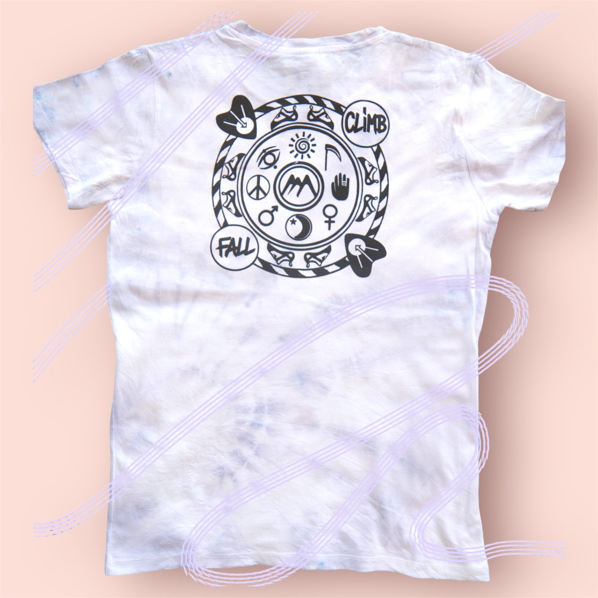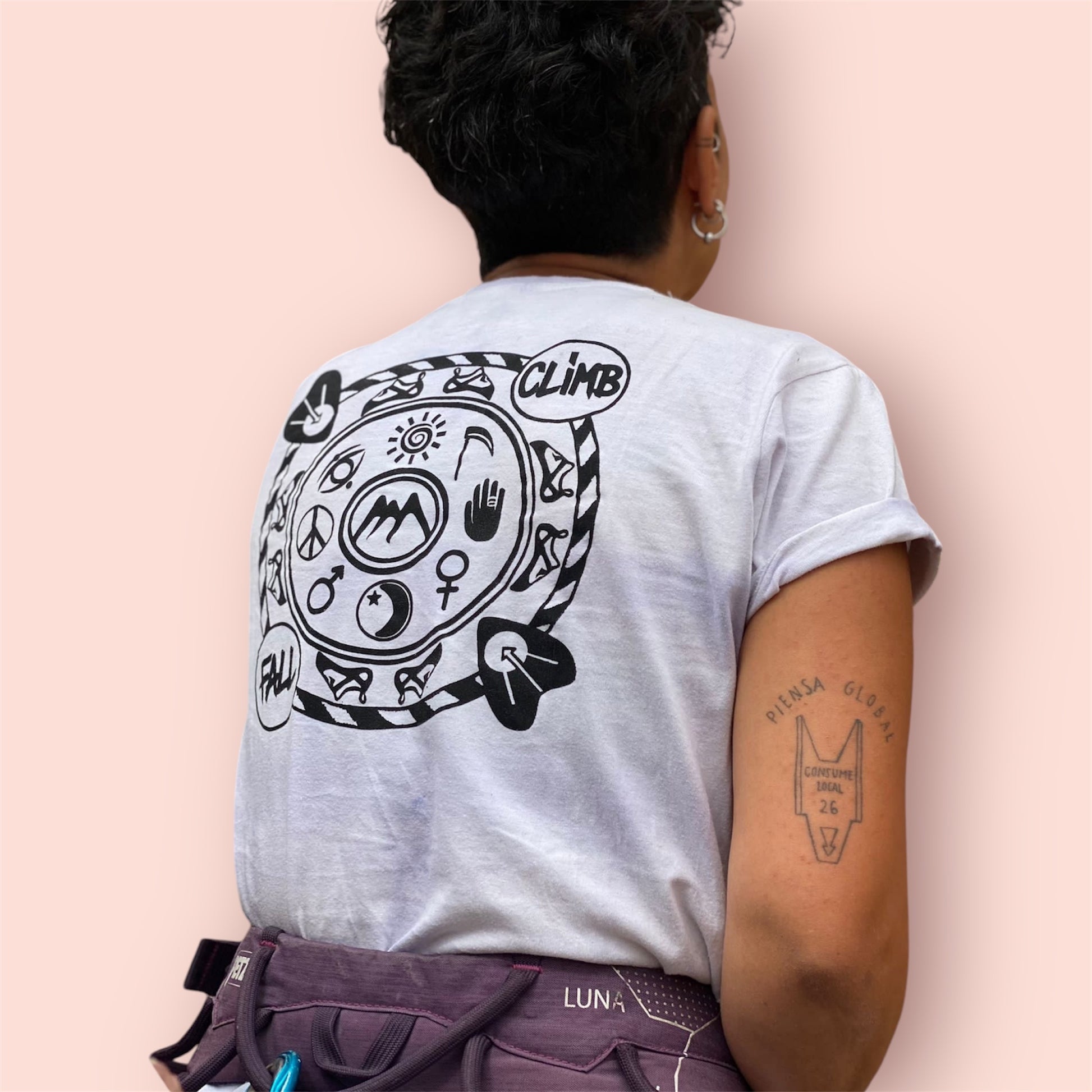 Screen printed ouija board design on the back and CLiMB like a girl logo on the front.